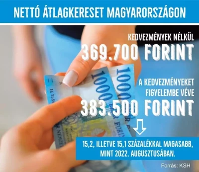 2023 októberében a teljes munkaidőben alkalmazásban állók bruttó átlagkeresete 564 400, a kedvezmények figyelembevételével számolt nettó átlagkereset 389 300 forint volt – közölte a Központi Statisztikai Hivatal (KSH).A 9,9 százalékos infláció mellett emelkedt...